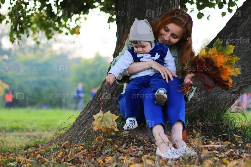 Рыжеволосая девушка с сыном Осенние листья