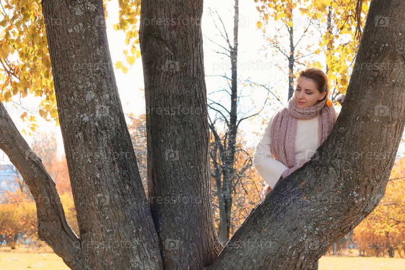 Девушка в парке носит осенний шарф
