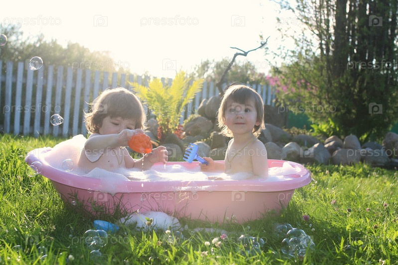 Близнецы мальчик и девочка в ванной воде на свежем воздухе