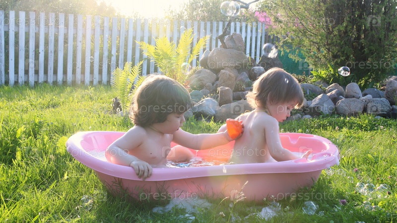 Близнецы мальчик и девочка в ванной воде на свежем воздухе
