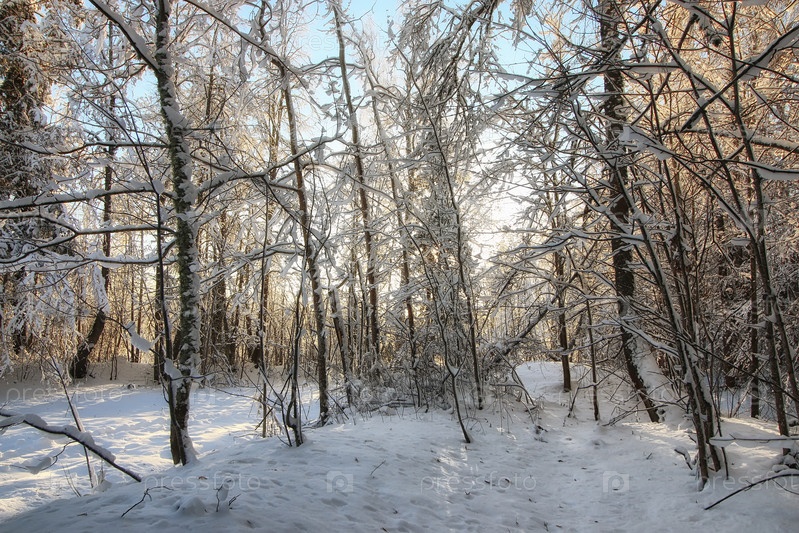 Зимний лесный пейзаж солнечный свет снег