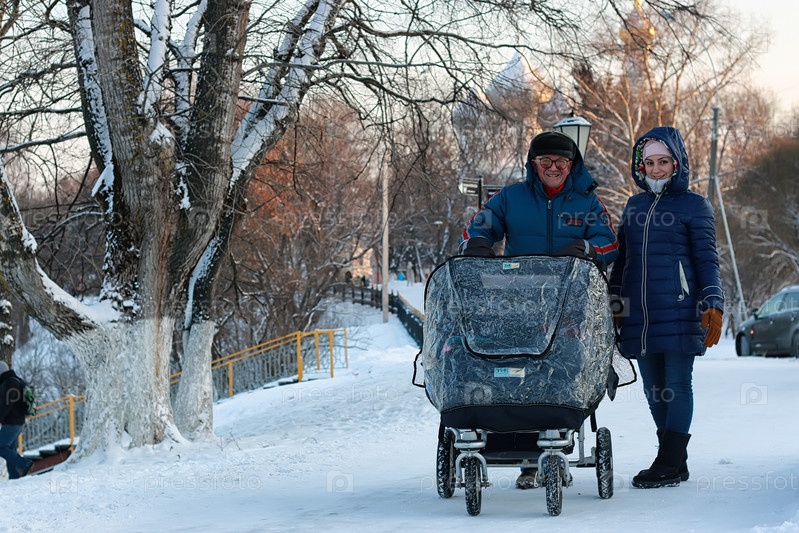 Старик и женщина ходят с коляской зимой
