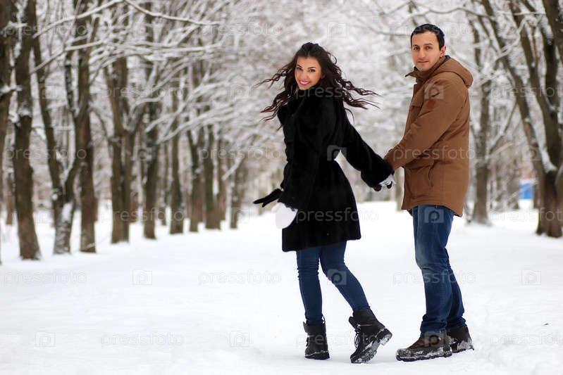 Красивая молодая пара в снежном парке обернулась