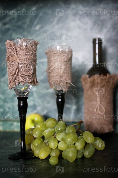 Бутылка вина зеленый виноград на фоне