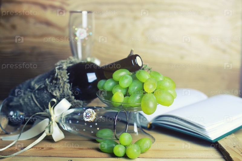 Деревянный стол с книгой бутылок вина и виноградом