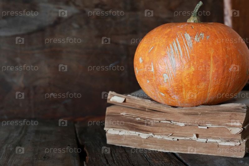 Тыква на старой книге и деревянном фоне