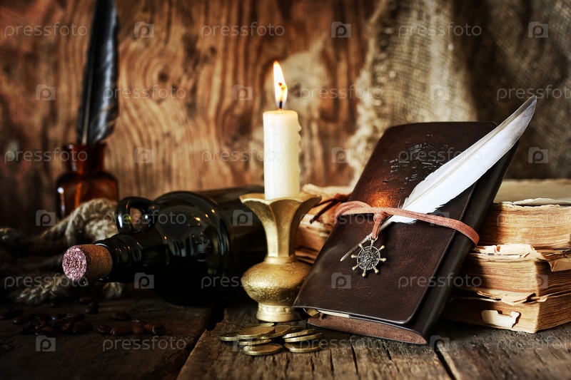 Дневник и перо с бутылкой рома