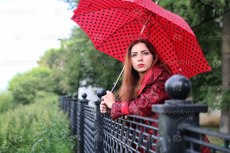 Женщина с красным зонтиком на уличном дереве