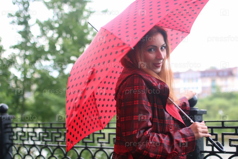 Женщина с красным зонтиком на уличном дереве