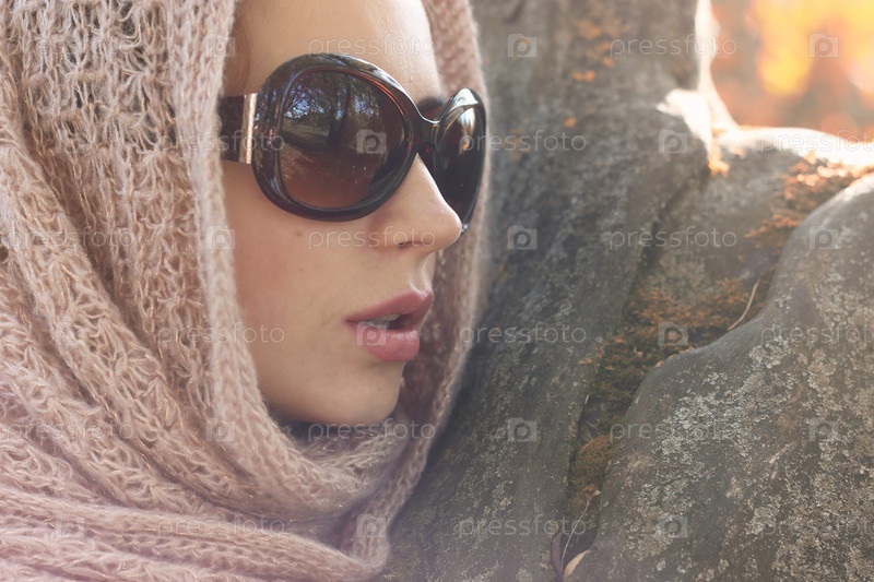 Девушка в парке носит осенний шарф