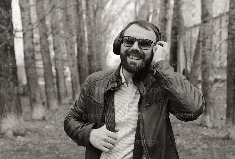 Монохромный бородатый мужчина слушает музыку в парке