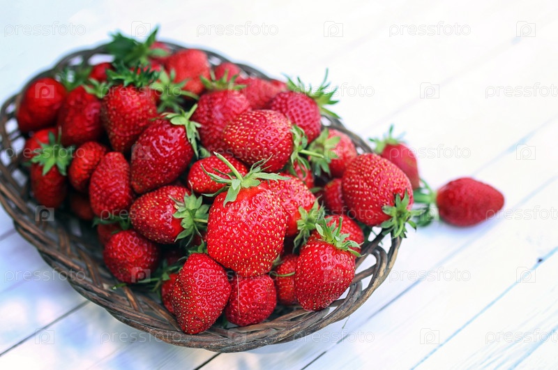 клубника в виковой тарелке на деревянном фоне