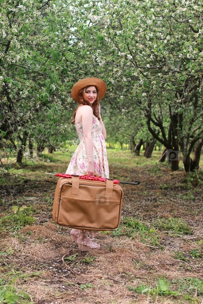Женщина наружное платье чемодан ретро-парк
