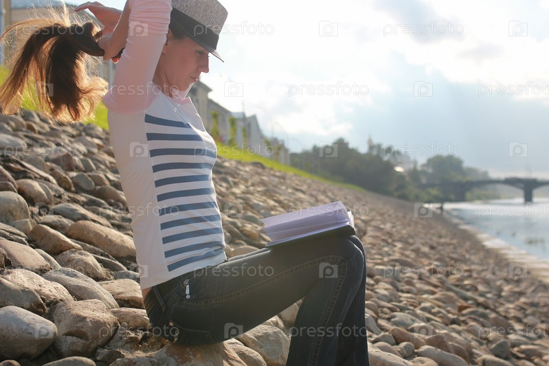Девушка на открытом воздухе читает книгу Stone River
