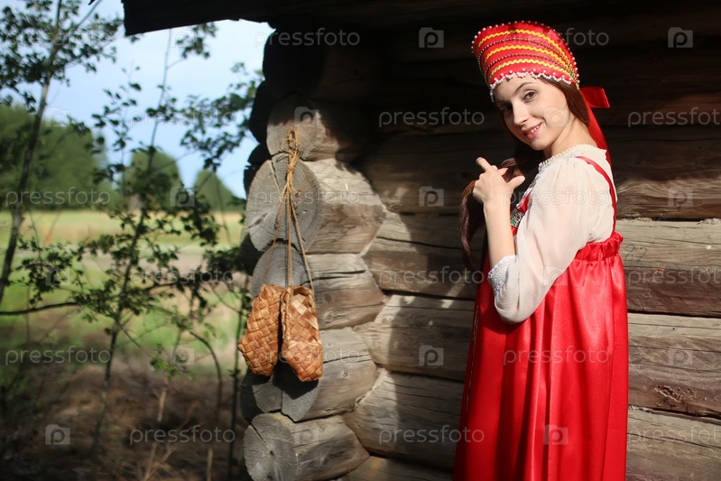 Девушка в традиционном платье деревянная стена