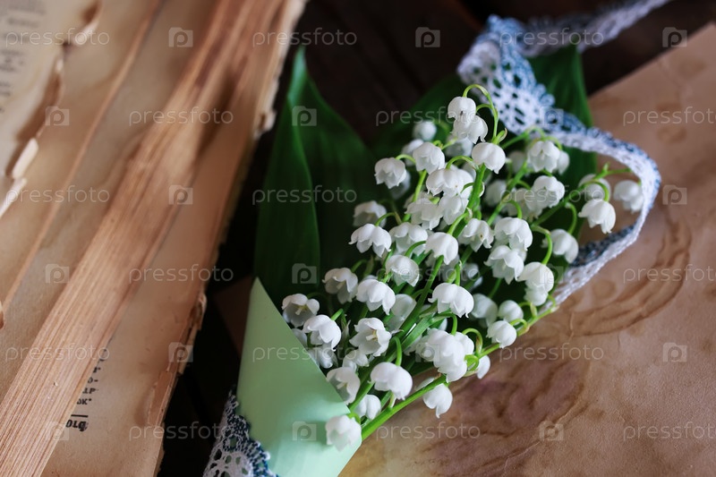 Букет свежих лилий долины и ретро книга