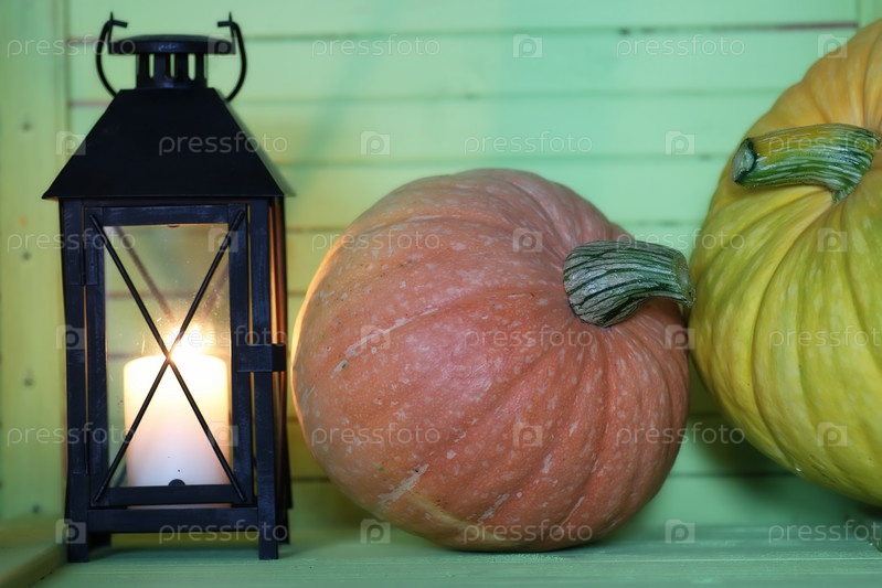 Тыква и лампа на деревянном столе