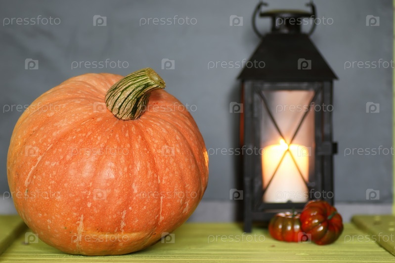 Тыква и лампа на деревянном столе