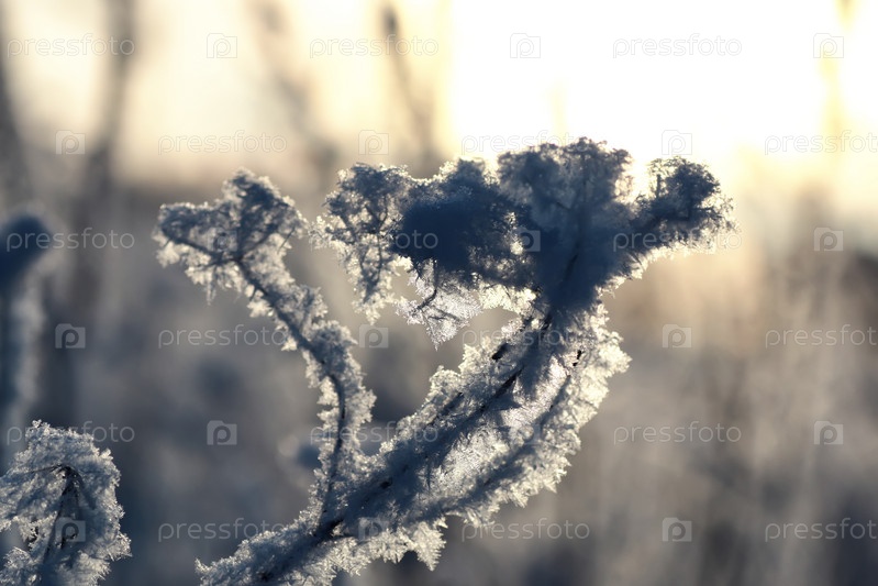 Ветка растения, покрытая снегом зимой макро