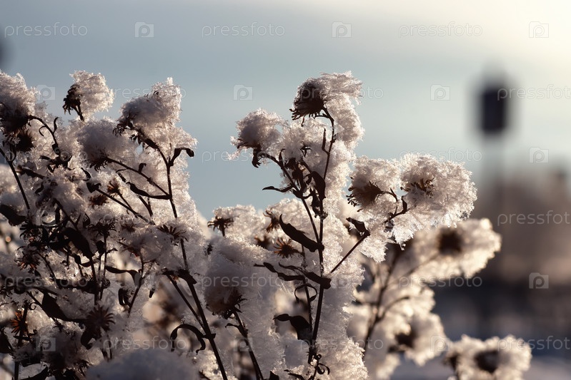 Ветка растения, покрытая снегом зимой макро