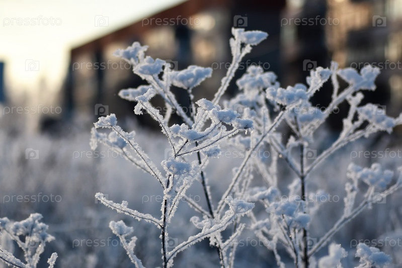 Ветка растения, покрытая снегом зимой макро