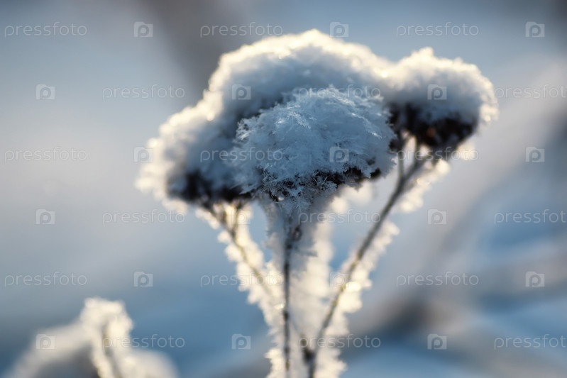 Ветка растения, покрытая снегом зимой макро
