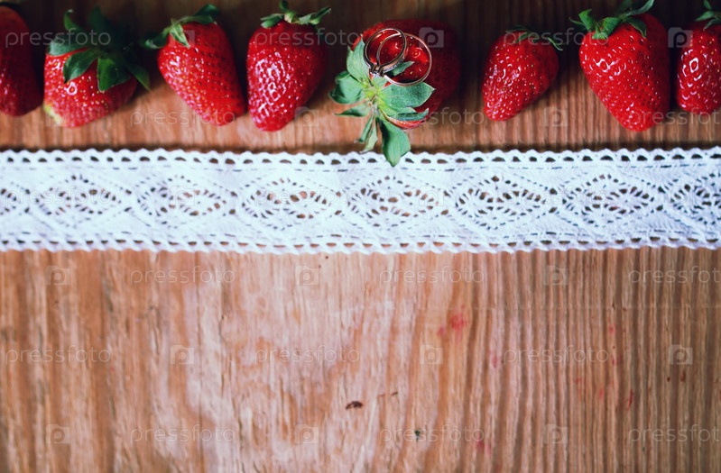 Красная клубника на дереве и кружевке