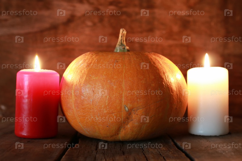 Тыква и свеча на старой деревянной
