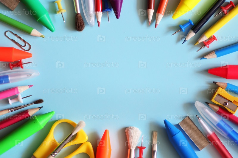 канцелярские принадлежности на синем фоне