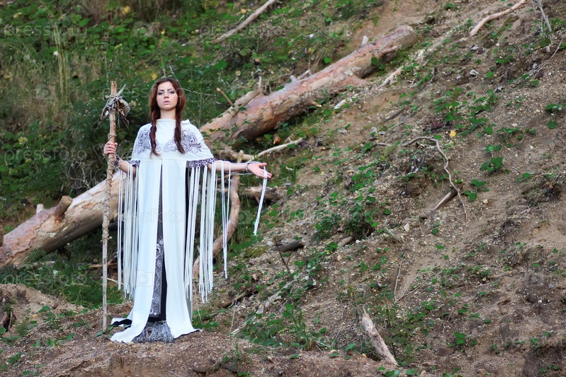 Шаман с посохом и стеклянным шаром на открытом воздухе