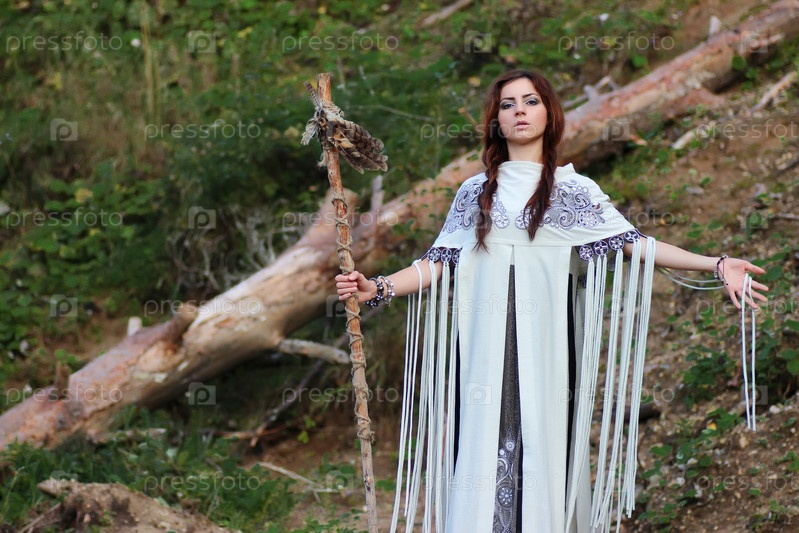 Шаман с посохом и стеклянным шаром на открытом воздухе