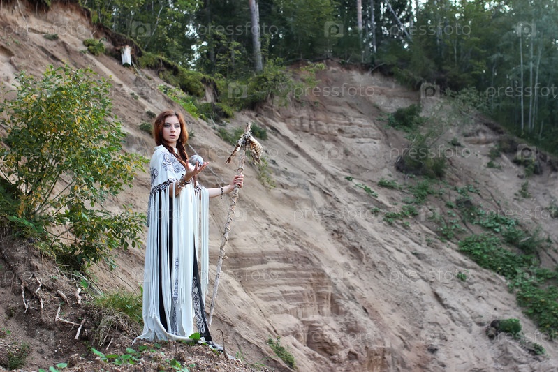 Шаман с посохом и стеклянным шаром на открытом воздухе