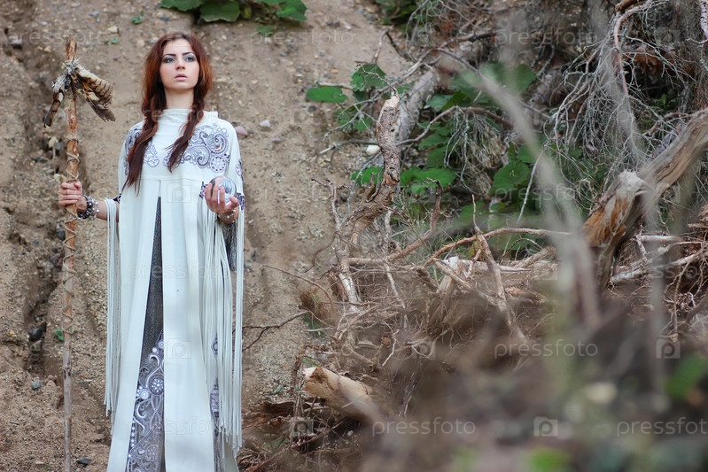 Шаман с посохом и стеклянным шаром на открытом воздухе
