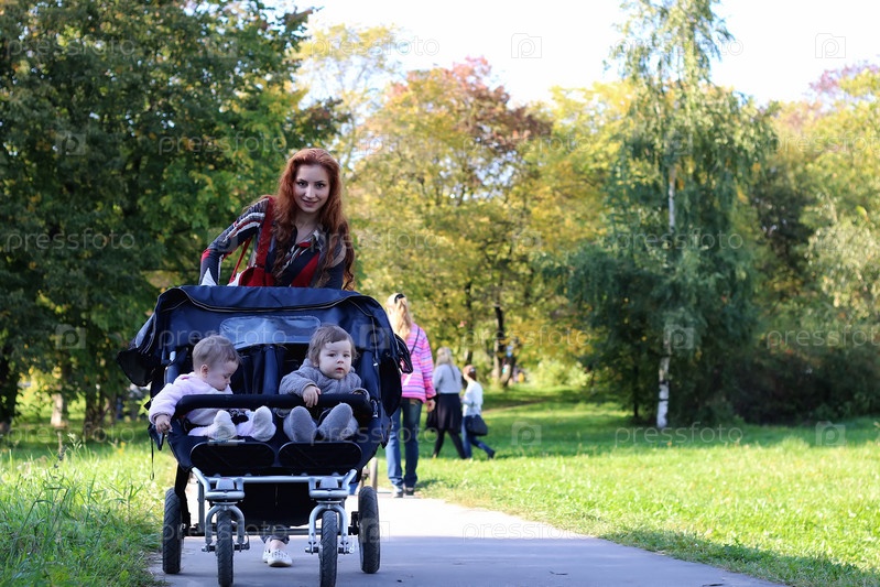 Женщины ходят на детской коляске летом