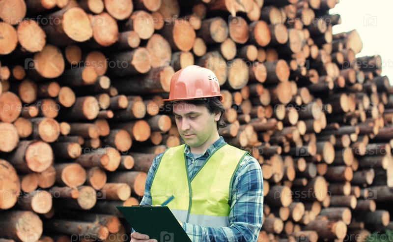 Работник в шлеме считает древесную лесопилку