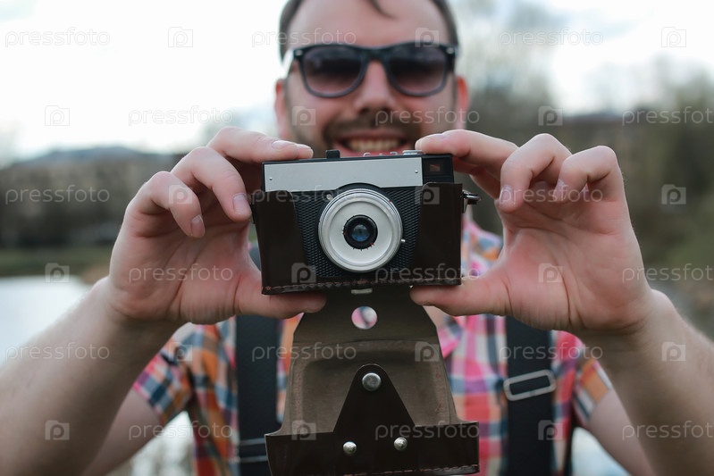 Бородатый человек с ретро-камерой в парке