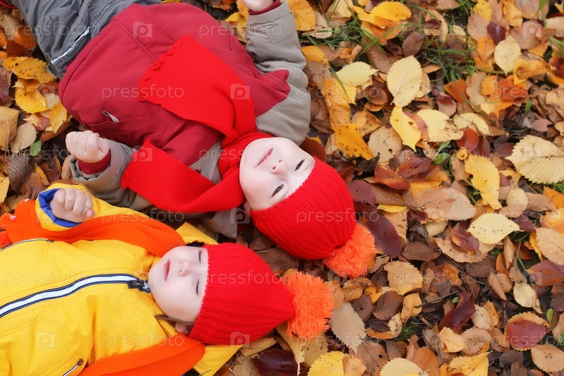 Дети осенью кладут листья