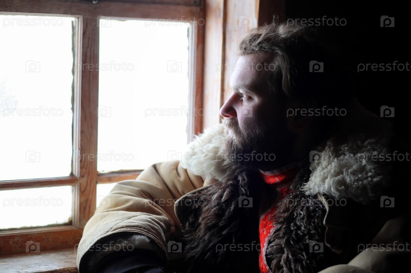 Человек в традиционном зимнем костюме крестьянского средневековья на русском