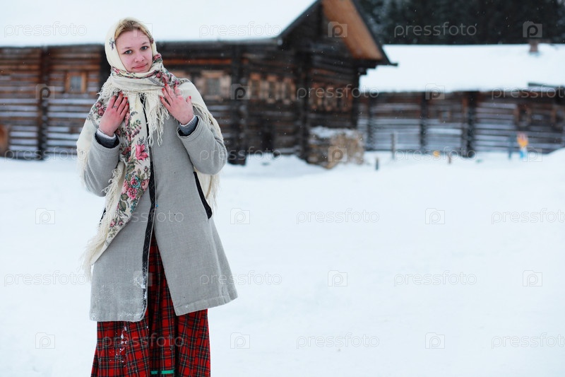 Молодые девушки в традиционных костюмах русского севера зимой