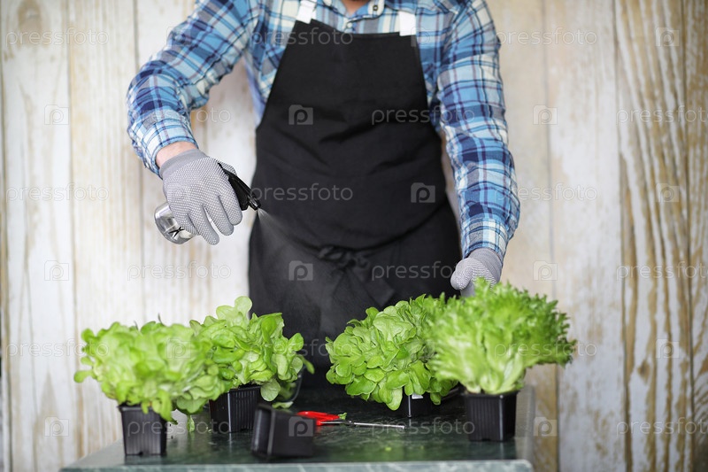 Бородатый мужчина ухаживает за салатами, которые выращиваются в горшках дома
