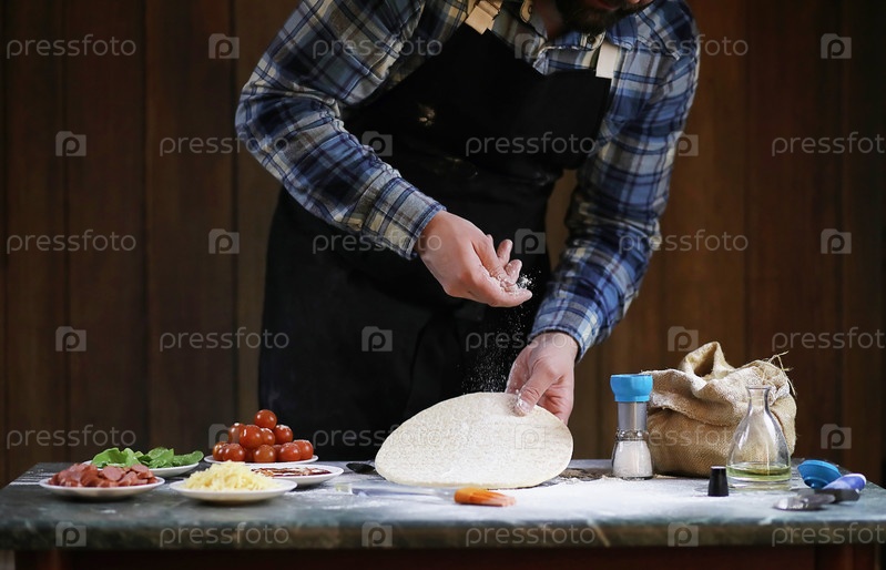 Мужчина готовит пиццу, измельчает тесто и добавляет ингредиенты