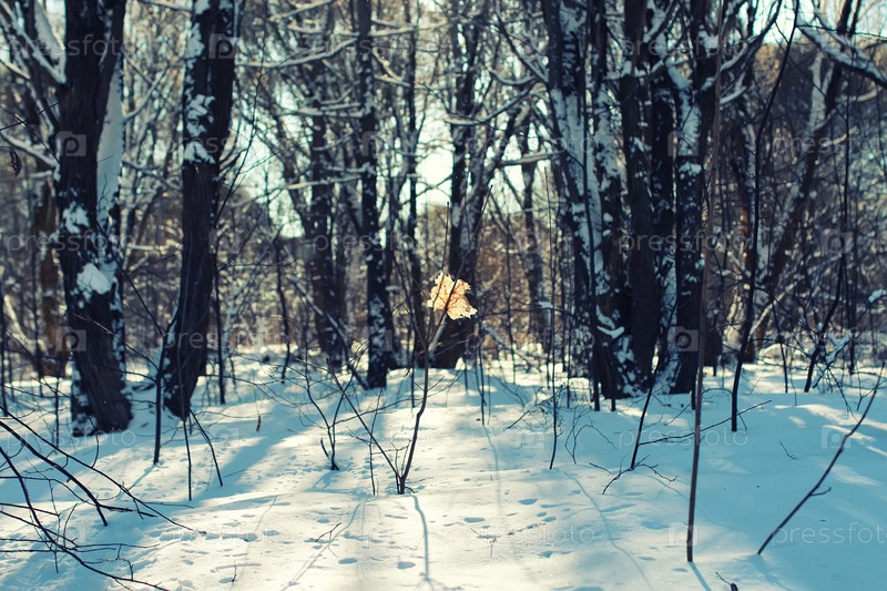 Одинокий лес листьев на зимнем дереве