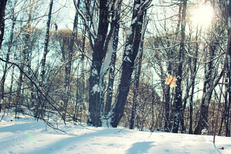 Одинокий лес листьев на зимнем дереве