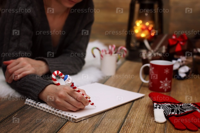 Девочка пишет перо на лист бумаги Рождественские пожелания