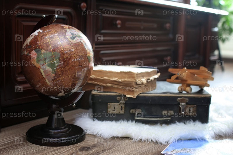 Композиция на деревянном полу винтажный глобус со старой кожей sui