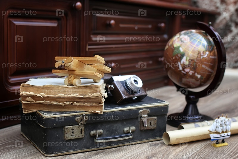 Композиция на деревянном полу винтажный глобус со старой кожей sui