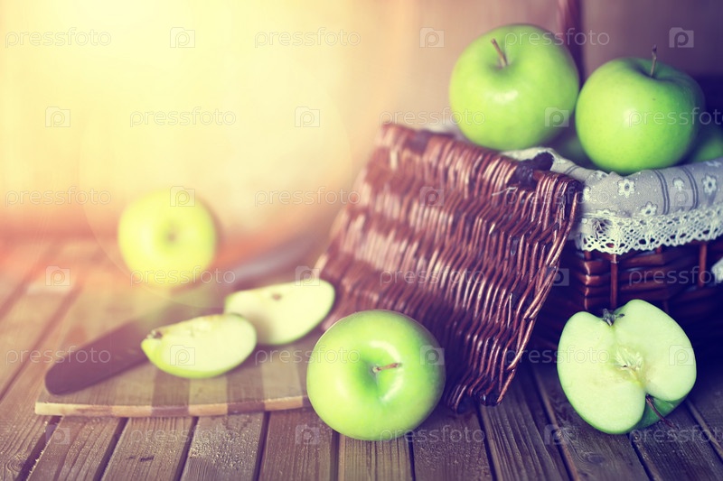 Солнечный свет зеленое яблоко в корзине деревянный фон