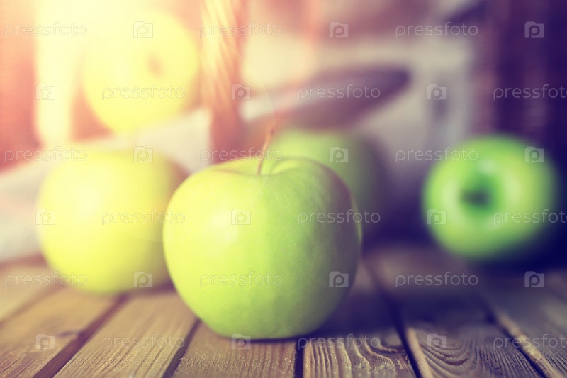 Солнечный свет зеленое яблоко в корзине деревянный фон