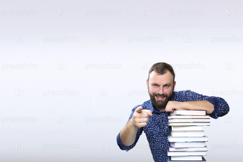 Студент взрослый бородатый мужчина со стопкой книг в библиотеке