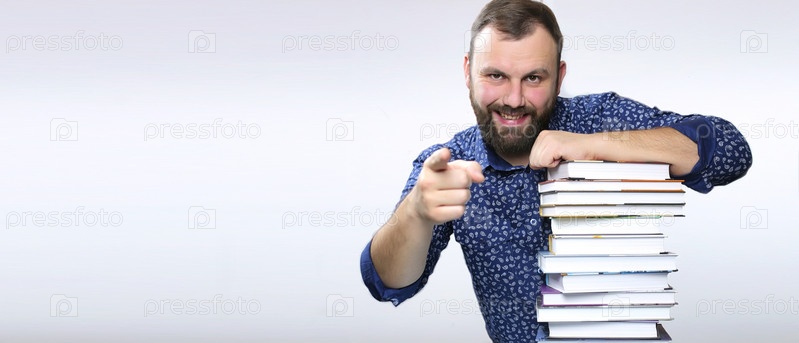 Студент взрослый бородатый мужчина со стопкой книг